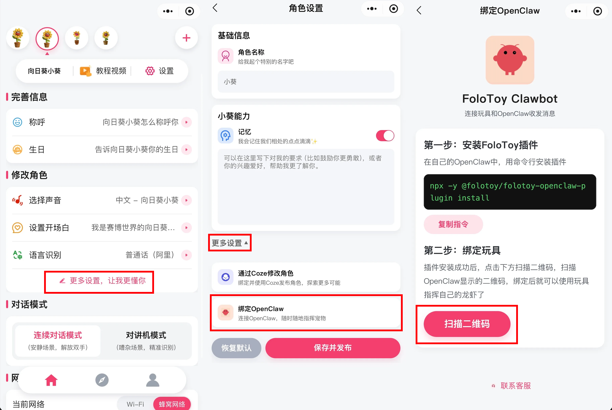 Go to Role Details → More Settings → Bind OpenClaw → Scan QR Code. See the screenshot below: