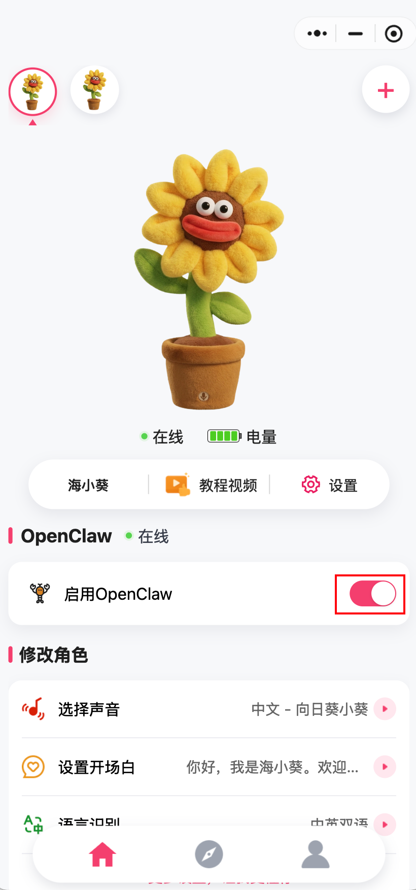 Wait for the success message. Once bound, the toy will automatically return to the home page, where you will see the OpenClaw online / enabled status.